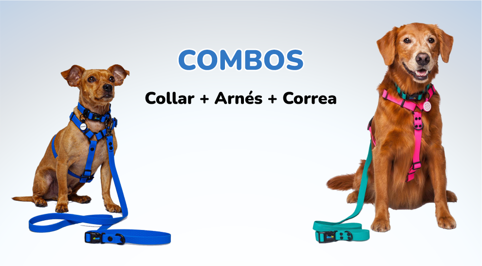 Descubre nuestros combos de arnés, collar y correa, diseñados para complementarse perfectamente.